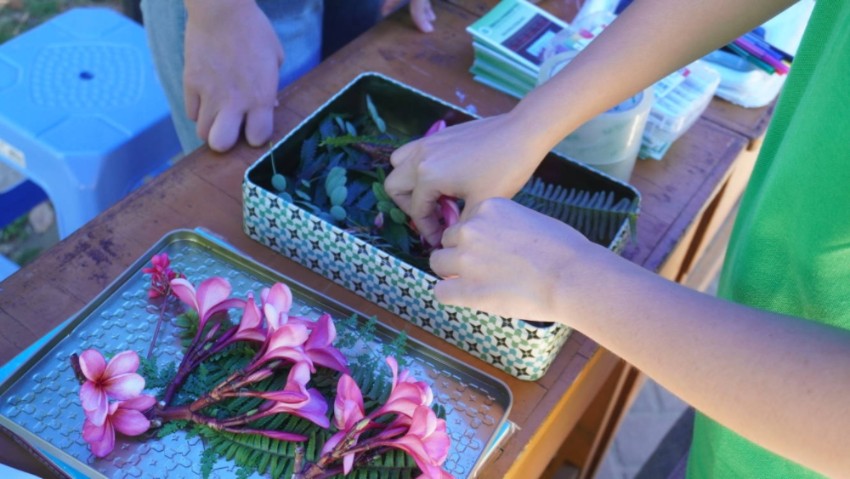 图为社区小朋友在用小锤子进行植物拓染。蒋启睿 供图