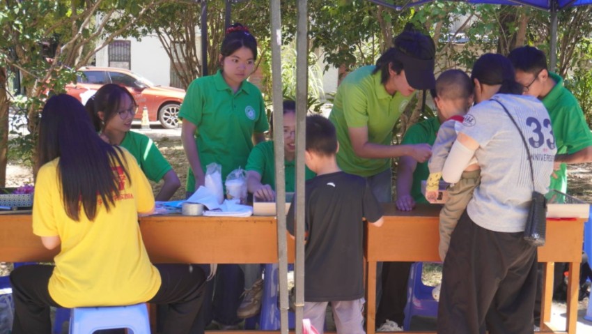 图为实践队员帮助社区儿童完成植物拓染作品。蒋启睿 供图