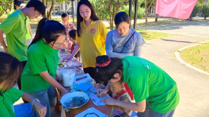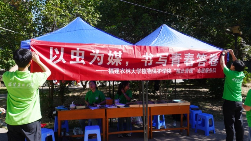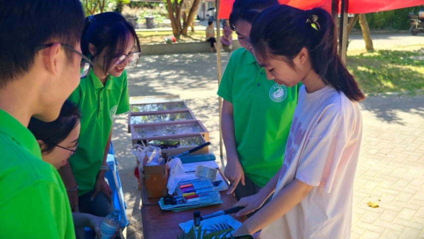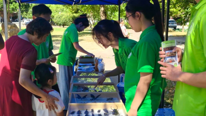 2025年7月7日,福建农林大学植物保护学院“植此青绿”实践队走进福建省福州市仓山区建新镇淮安社区,开展了“以虫为媒,书写青春答卷”的自然科普活动。实践队员带来了形态各异、种类繁多的昆虫标本,向居民们介绍了昆虫的分类、生活习性以及它们在生态系统中的重要作用。队员们还分别准备好了各种树叶、花瓣等植物材料与折纸材料,带领居民们动手体验植物拓染与折纸活动,一幅幅精美的植物拓染作品与一个个灵动的昆虫折纸在大家的手中诞生。本次活动不仅让居民们近距离接触了奇妙的昆虫世界,还让大家感受到了自然的魅力和手工的乐趣。