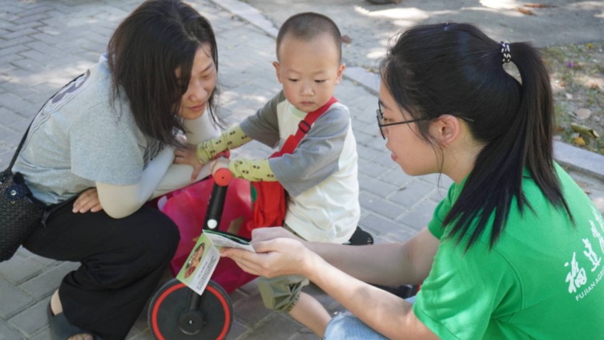 图为实践队员用宣传手册向社区儿童与家长介绍活动内容。蒋启睿 供图