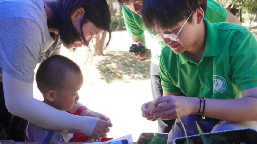图为实践队员在向社区小朋友介绍蝴蝶的各种形态。蒋启睿 供图