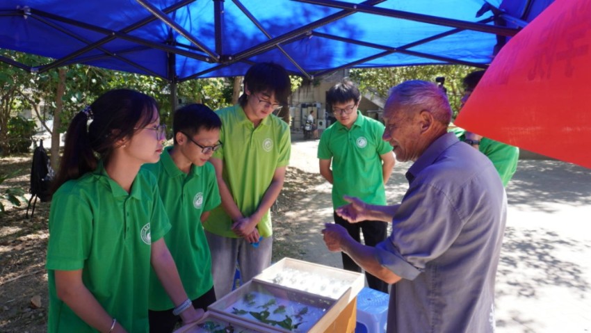 图为实践队员与社区老人交流昆虫学知识。蒋启睿 供图