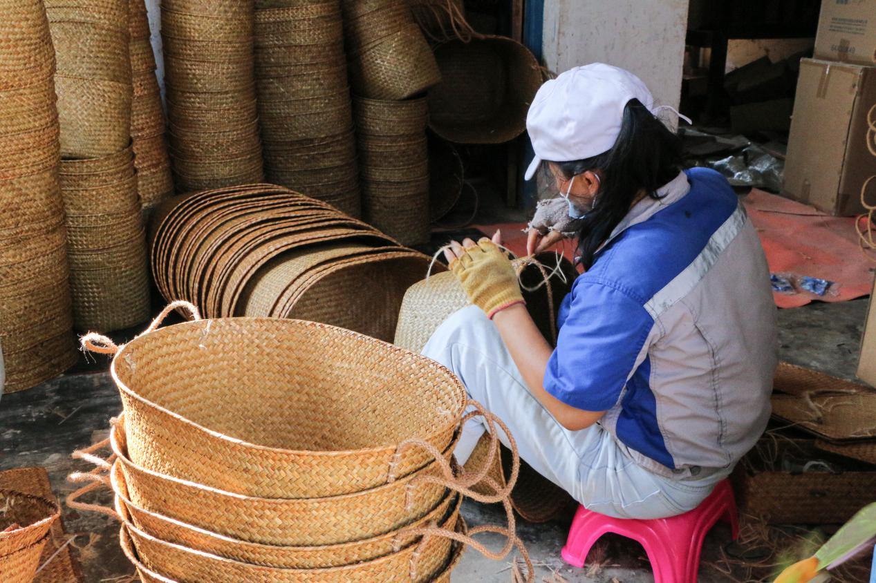 连线了当地的工作人员,展示了精湛的蒲草编织工艺,一根根普通的蒲草在工作人员手中,经过巧妙的编织、造型,变成了精美的篮子、垫子等工艺品。