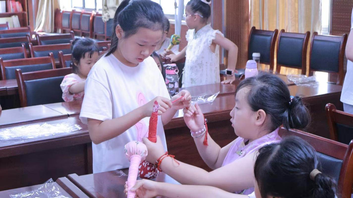 “大家小心手中的艾草包不要弄洒了。”鲁丹妮老师一边叮嘱孩子们一边手托艾草锤模型:从艾草锤头部的草包到根部的布袋,都体现着对古代传统文化的传承与发展。制作环节气氛热烈,团队成员向孩子们分发艾草锤制作的材料。在团队成员们的帮助下,孩子们用双手将棉布与艾草包逐一包裹起来,一个个精美的艾草锤出现在孩子们的手中。孩子们将制作好的艾草锤高高举起,与他们洋溢着的笑脸相互映衬。