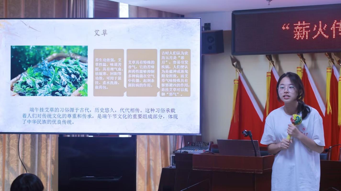 课堂伊始,鲁丹妮老师手持艾草锤,借助端午时节艾草驱邪纳福的文化象征,开启一段文化之旅。鲁老师通过课件引领学生穿越时空,见证艾草如何从远古祭祀的神坛走入寻常百姓的养生日常。其间,老师以《红楼梦》中艾草锤的雅称——“美人拳”为引,巧妙地揭示精巧的外形与文化魅力。“由古至今,瑶族人民把明清的艾草锤文化与现代的刺绣文化紧密结合起来,用他们的智慧与创造力将艾草文化传承发展至今。”在鲁丹妮老师绘声绘色地介绍下,教室中响起惊叹声,“原来小小的艾草锤承载着这么厚的文化!”