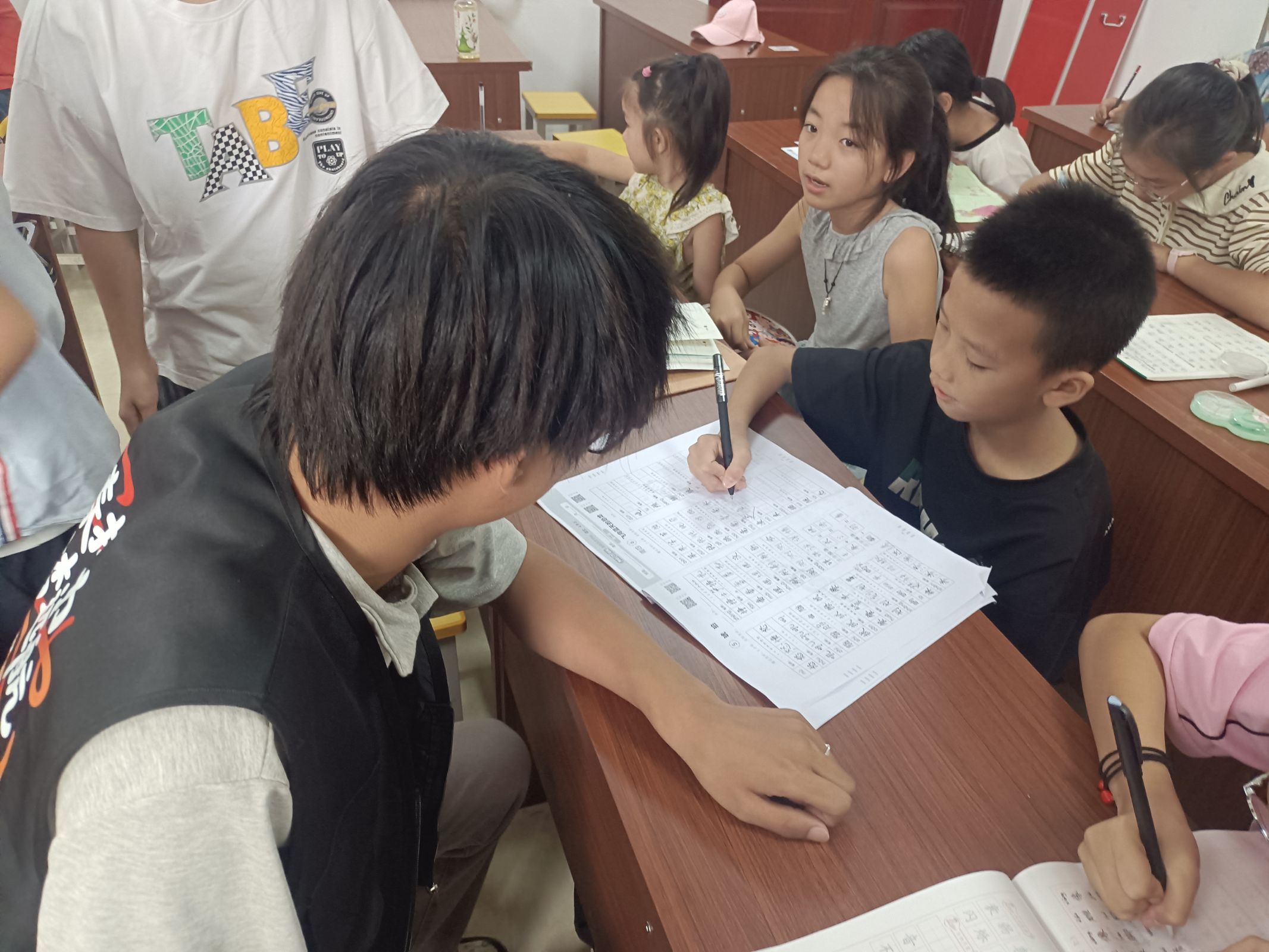 午后,实践队转入学业辅导环节。针对不同年级儿童的学习需求,队员们分组进行一对一答疑,重点梳理数学难题和语文阅读理解中的困惑。辅导结束后,一场生动的语文常识小课堂随即展开,内容涵盖“汉字的演变”“标点符号的正确使用”等知识。队员们通过猜字谜、成语接龙等互动形式调动孩子们的兴趣,在讲解“明”字时,引导大家理解“日+月=明”的构字逻辑,孩子们听得专注,纷纷提笔记录。