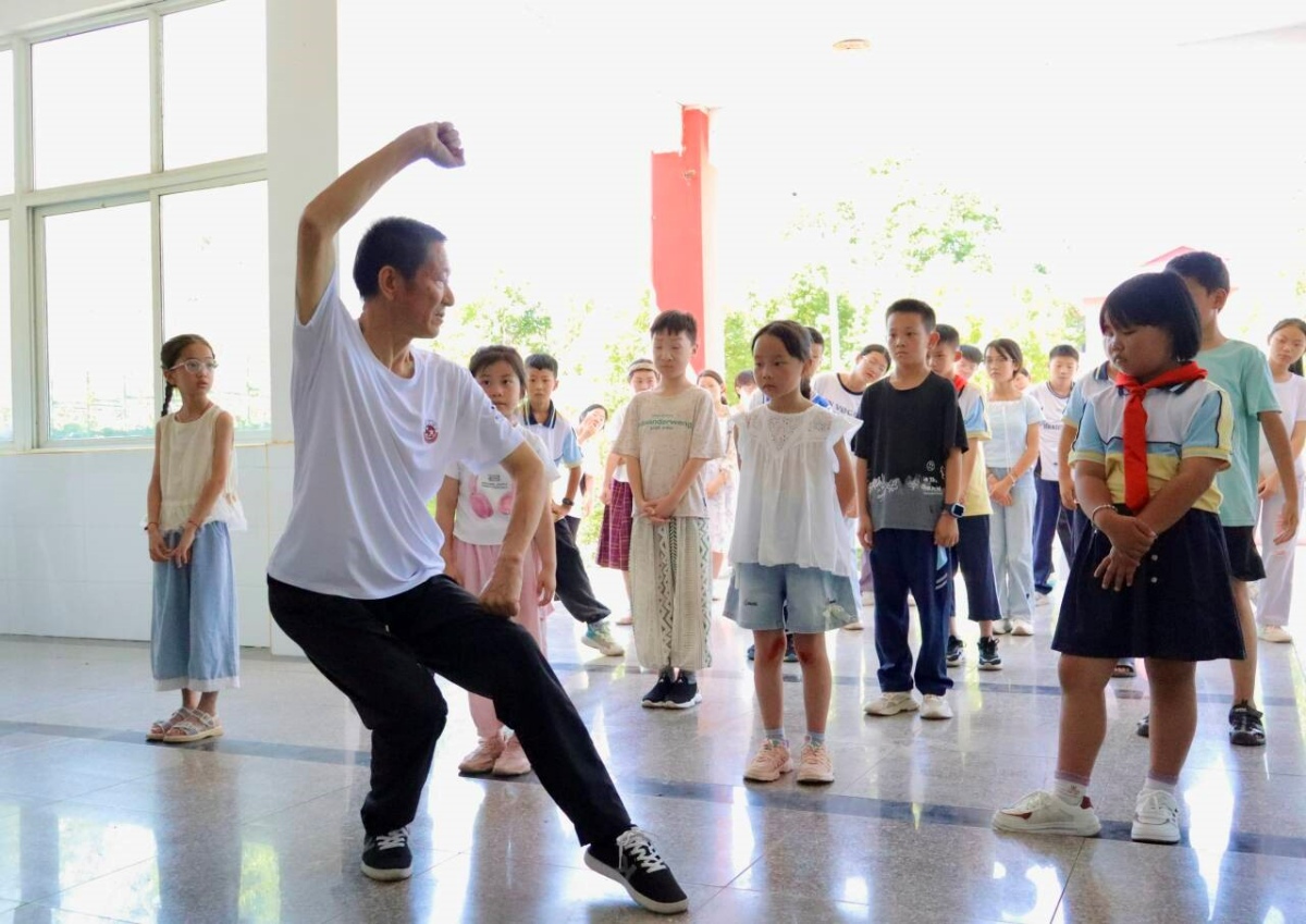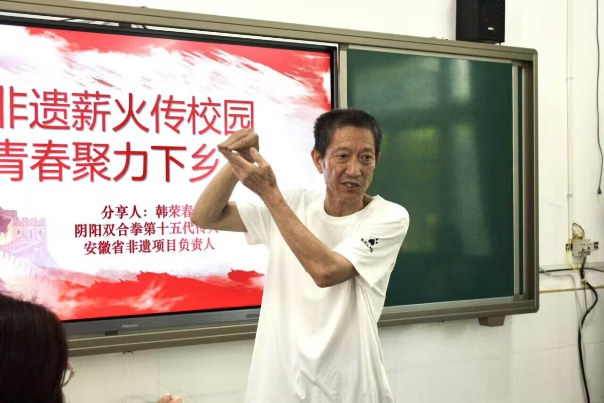 7月4日,合肥大学语言文化与传媒学院暑期三下乡社会实践团队邀请阴阳双合拳第六代传人、安徽省非遗项目负责人韩荣春老先生,于石板冲乡初级中学开展非遗技艺教学活动与“非遗进校园”分享会,推动中华优秀传统文化创造性转化与创新性发展。