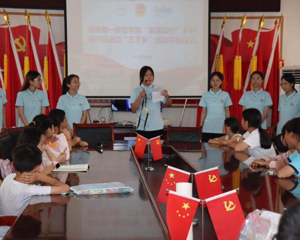 (通讯员:刘蔓仪)7月6日下午,湘西古丈县会溪村村部洋溢着青春的气息,湖南第一师范学院"惠溪知行"乡村振兴促进团2025年暑期实践开班仪式在此举行。促进团全体成员、当地20名学生及家长代表、村“两委”干部共同见证了这一重要时刻。