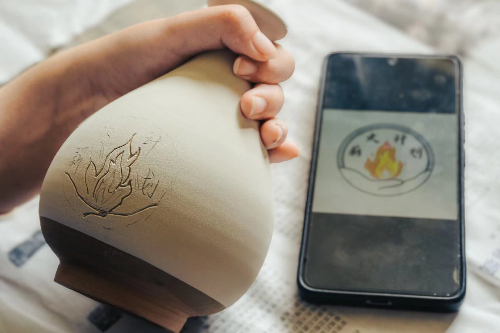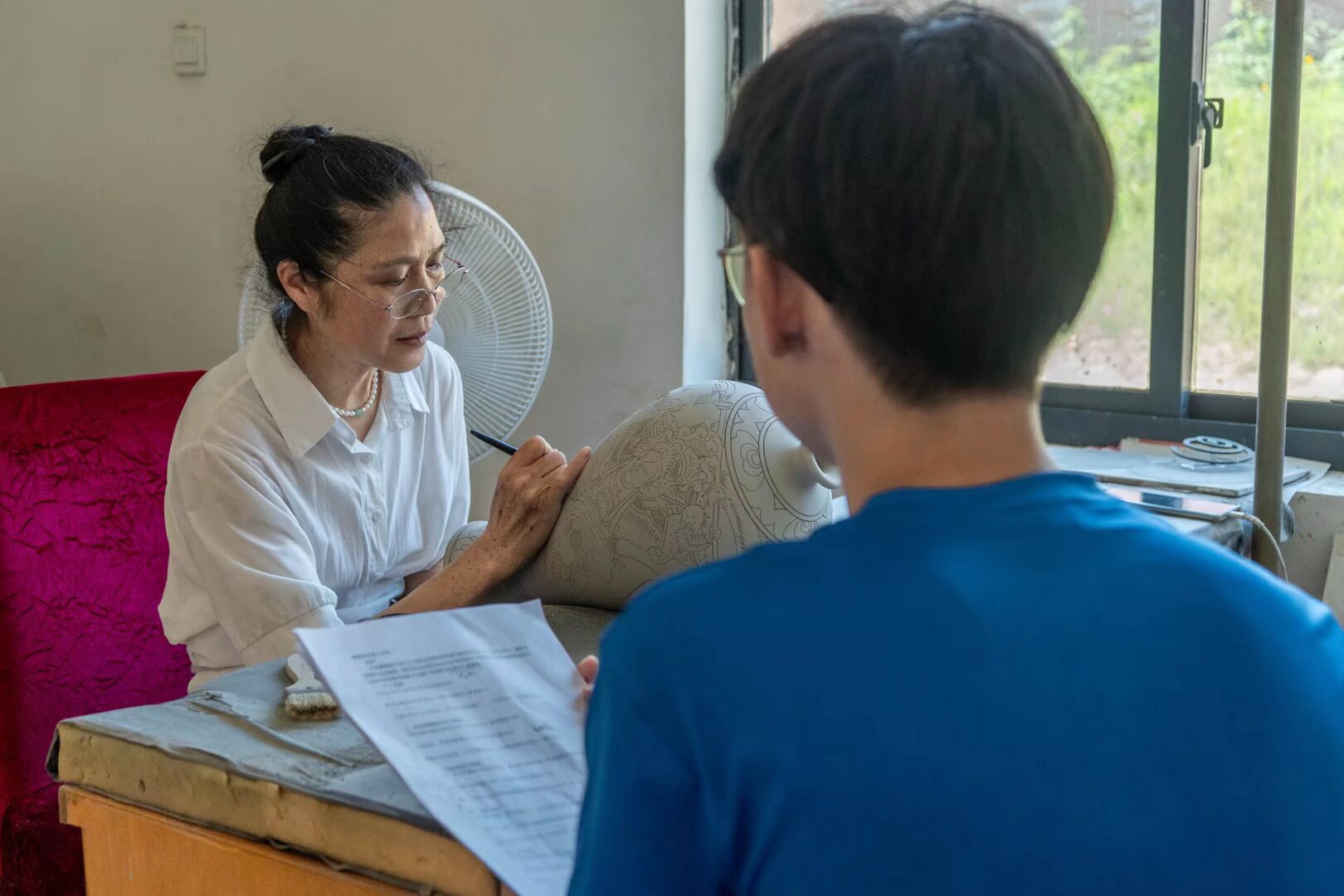 怀着崇敬之情,调研团成员采访了正在专注刻画 "刀马人" 纹饰的卢莉华老师。她的工作室里,工具整齐地摆放着,案台上的坯体已初见雏形,处处彰显着艺术氛围。