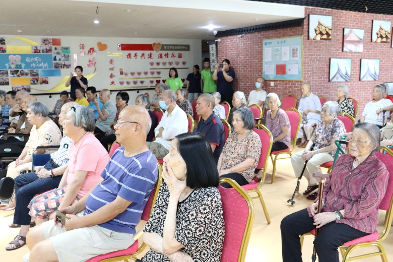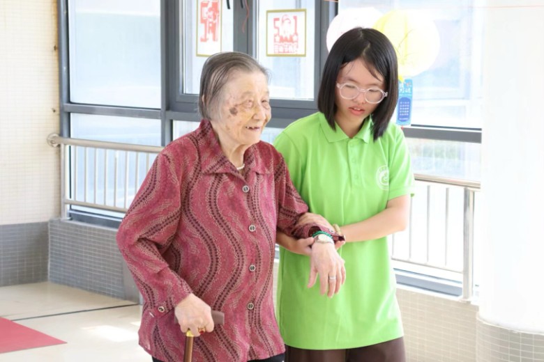 图为实践队成员搀扶老人入座 通讯员 黄雨彤 摄