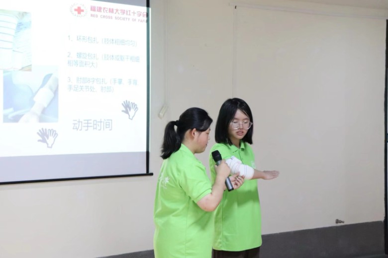 图为实践队队员进行包扎技能的演示教学 通讯员 黄雨彤 摄