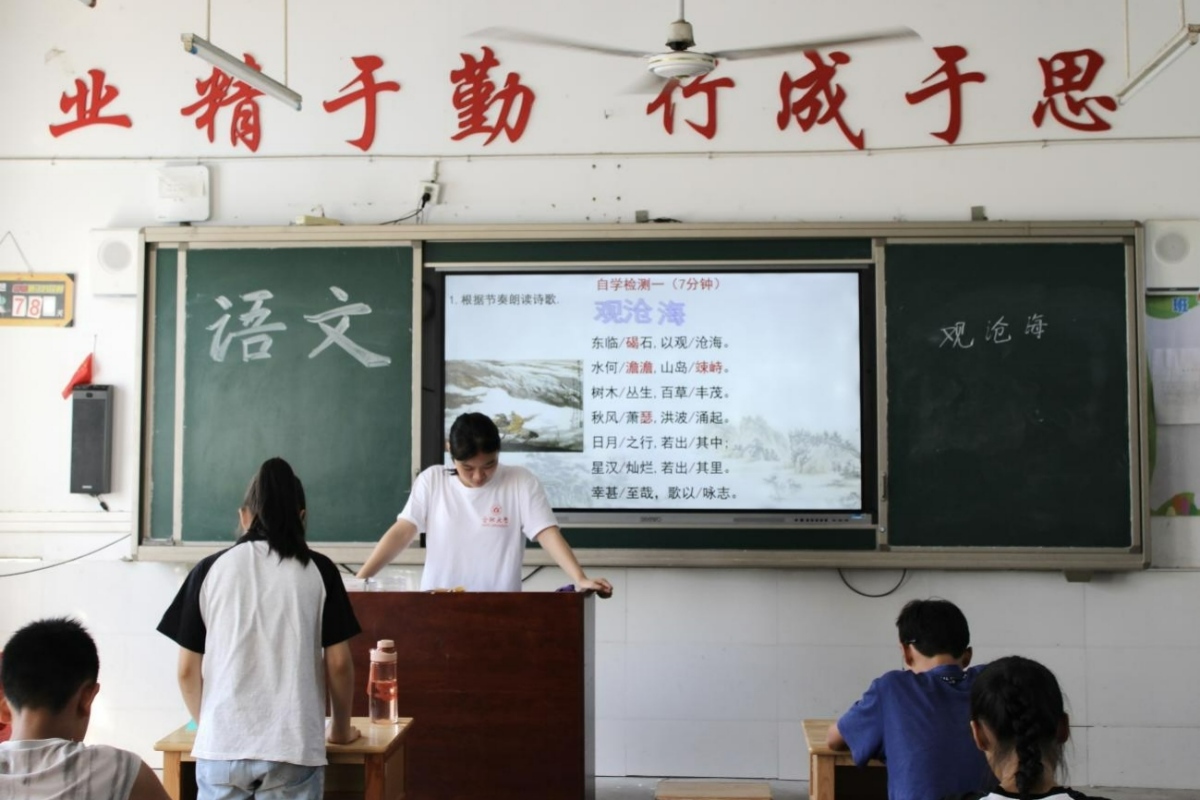 招生宣讲完毕后,教学组相继开启趣味课堂。绘画涂色课充满童趣与创想。英语课互动教学激发孩子们的学习热情。语文课让学生感受诗词雄浑意境。这些趣味课堂,以多元形式拓宽乡村孩子知识视野,在激发学习兴趣的同时,借文化课程厚植人文底蕴,用青春力量为乡村教育添彩,助力文化传承与振兴 。
