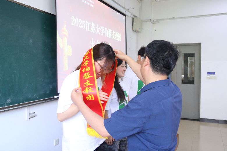 随后,文心书院党总支书记吴立平为仪式注入了更多温暖力量。他以“远方的约定”为喻,鼓励队员们珍惜此次支教机会:“每一次出发,都是对初心的践行;每一次相遇,都是对成长的馈赠。”讲话结束后,吴立平书记为支教团成员一一佩戴绶带,点燃了大家奔赴远方的热忱。