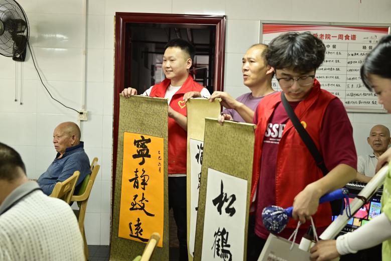 实践团成员为老人们讲解艾草锤制作过程并协助制作 活动最后,实践团为敬老院送上了精心书写的书法作品。一幅幅作品字迹遒劲、墨香四溢,“宁静致远”“松鹤龄” 等内容饱含着对老人的美好祝福。老人们接过作品,脸上洋溢着幸福的笑容。
