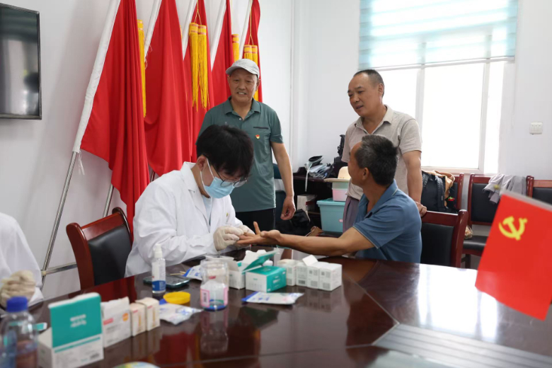 7月1日,实践团赴安徽红色区域中心纪念馆学习革命历史,领悟红医精神内涵。随后在古桥畈村、落儿岭村党群服务中心为老党员开展“赤心融皖医路行”义诊,提供血压测量、健康咨询等服务,将“治未病”理念与现代健康管理结合。老党员分享奋斗故事,团队成员在实践中深化“以医学服务群众”的使命认知。