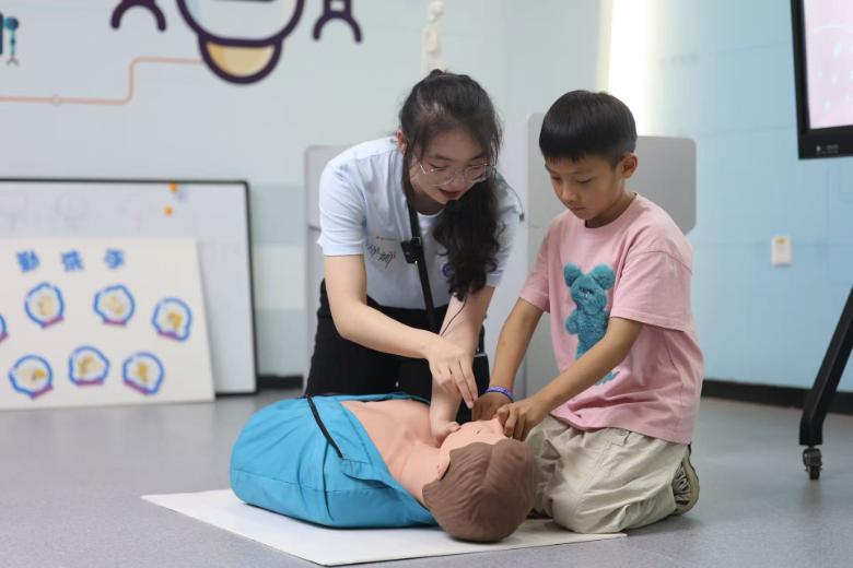 实践团在霍山县科技馆开展健康科普,成员以“童趣化” 方式讲解心肺复苏“黄金 4 分钟”、海姆立克急救法“剪刀石头布”口诀等知识,配合人体模型演示与实操考核,带领儿童学习七步洗手法、人体骨骼结构、体重管理及防溺水常识。此外,通过五禽戏展演、武术互动传递强身理念。活动最后,儿童在队旗留下手印,象征健康理念与红医精神的传承。