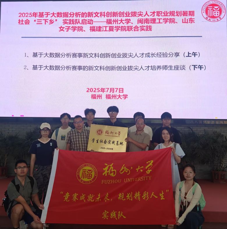 为了响应习近平同志在《扎实推动教育强国建设》中提出“加强拔尖创新人才自主培养”号召,打通束缚新质生产力发展的新文科创新创业拔尖人才堵点卡点,2025年7月7日福州大学联合闽南理工学院、山东女子学院、福建江夏学院基于大数据分析的创新创业拔尖人才职业规划暑期“三下乡”实践队在福州大学正式启动。