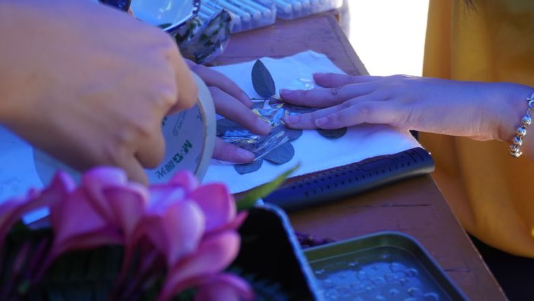 次日团队来到了淮安社区。植物敲拓染区域摆放着福州本地采集的琴叶珊瑚、鸡蛋花、蕨类等植物,社区居民在志愿者示范下,将叶片摆放在白布上,用胶带固定,通过锤子反复敲击,随着“咚咚”声响起,叶脉的纹路逐渐在布料上绽放。这是一种将植物的颜色和形状通过敲击的方式转移到布料或纸张上的传统手工染色技术,充满自然趣味。社区居民踊跃报名参加,创作出许多美丽的艺术品。