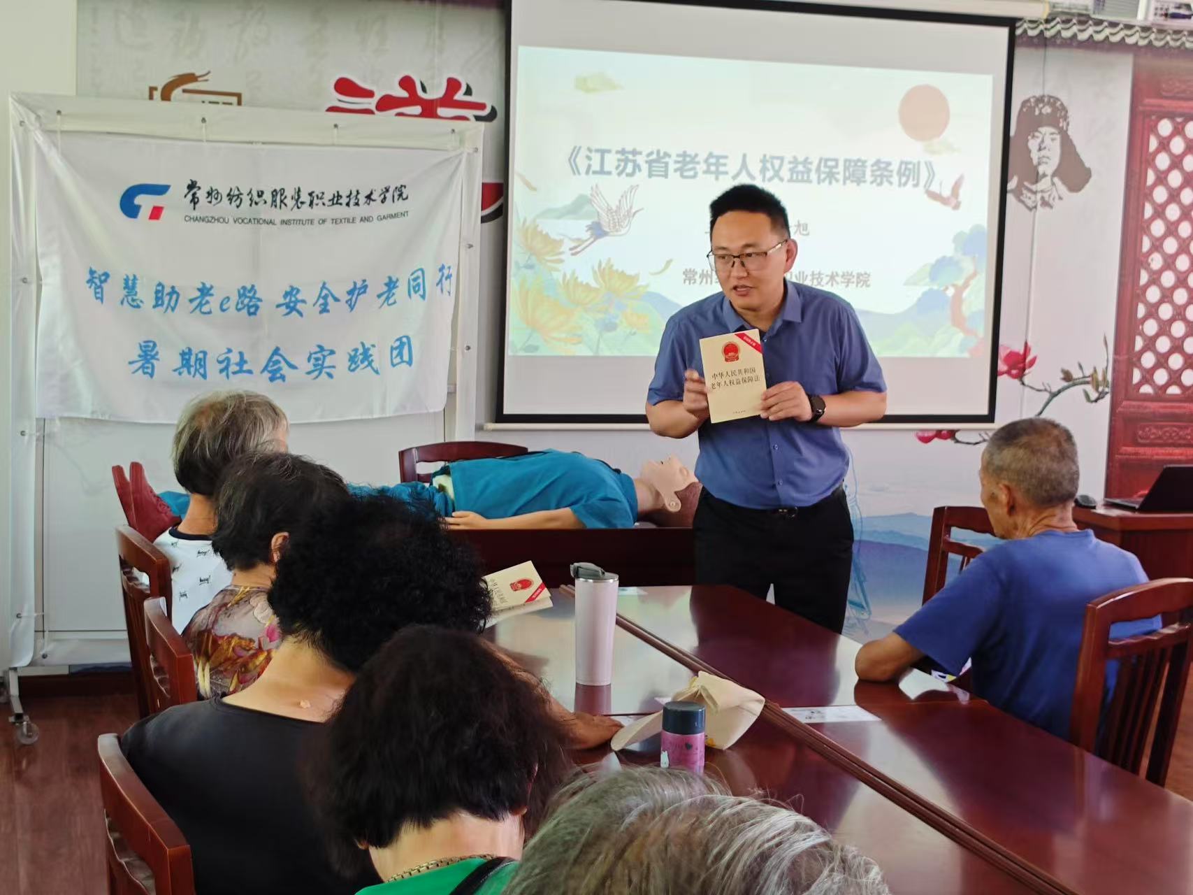 活动期间,实践团精心策划并实施了五大主题板块,内容丰富、形式多样。在“学急救知识,守家人平安”环节,志愿者们现场演示了AED器材的使用方法和人工呼吸操作流程,使老年人掌握了基本的应急救护技能,增强了他们在紧急情况下的自救互救能力。在“宣普法知识,护老年权益”板块,指导老师俞旭为老年人带来了生动的普法宣讲,提高了他们的法制意识,同时,他还提供了现场咨询服务,解答老年人在法律维权方面的疑惑,并助力构建社区与法律顾问的长效合作机制。在“银发就业发余热,社会添彩增活力”环节,实践团成员先后调研了常州市人社局、武进区人才服务中心与竹园社区党群服务中心等相关部门,系统了解了当前常州市人口老龄化的现状,以及应对人口老龄化所采取的再就业措施,实践团将针对调研数据结合学校优势助力常州老年人再就业政策的制定与相关服务的推进。
