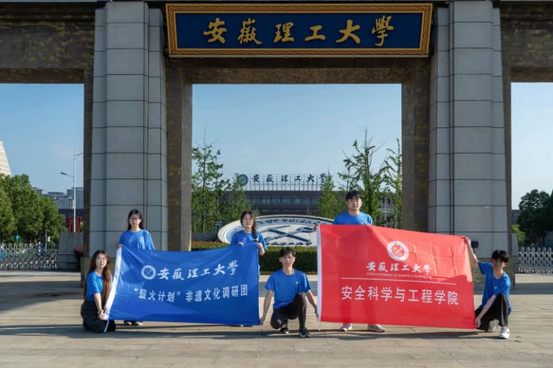 图为“薪火计划”调研团团队成员出发界首前于安徽理工大学南门合照。李心妍摄