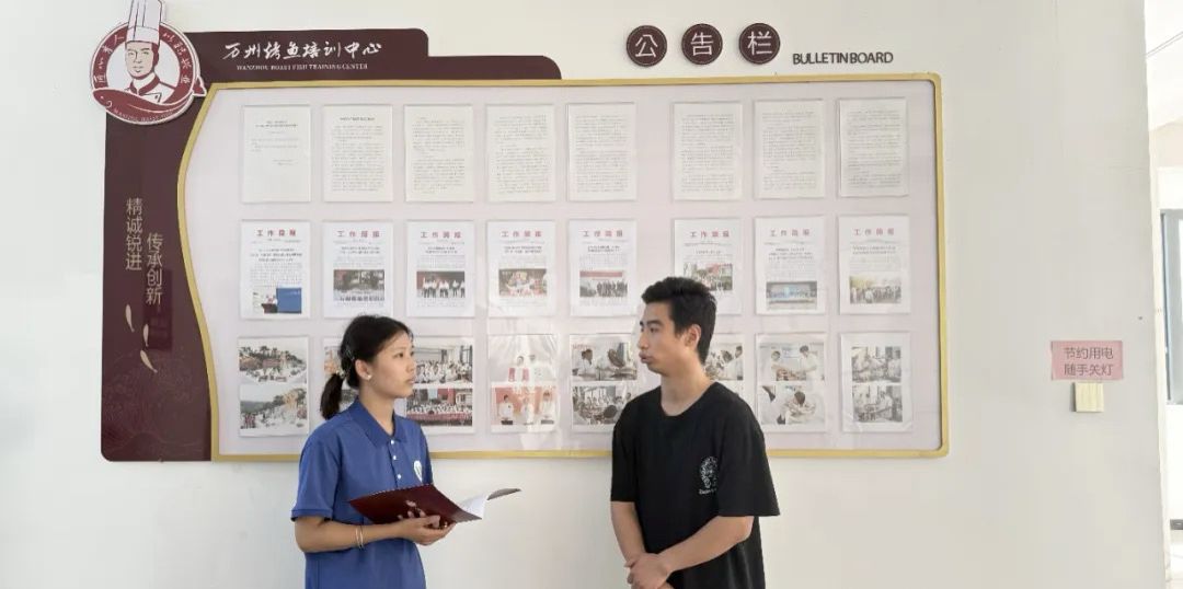参观进程中,培训中心负责人向队员们介绍。在这里,学员不仅要掌握精准的火候、秘制的酱料,更要深入学习万州烤鱼从长江渔家智慧升华为非物质文化遗产的厚重历史。这种“技艺+文化”的双轨教学,让古老技艺真正“活”在当下,更让队员们动容的是烤鱼背后的“共富链”,通过访谈了解到, 培训中心与周边乡镇签订定向采购协议,助力乡间渔业养殖农户,为合作农户建立稳定销售渠道,解决“卖难”痛点,同时教授的优秀学员被推荐至乡村合作店就业或返乡创业,技术反哺家乡,开辟一条烤鱼的“共富”旅程。
