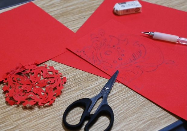 手工教学环节将课堂氛围推到了高潮。在志愿老师的指导下,孩子们拿起工具,开启了沉浸式体验模式。红色彩纸整齐划一地摆放在桌上,他们执笔在纸上跳跃,勾画出的是对美好幸福生活的向往以及对未来的期盼。拿起剪刀,细心剪落,眨眼间,一个精美的剪纸窗花便诞生了。一张张剪纸铺开,如同翩跹的蝴蝶,红红火火,似一团凝固的火,在光下透着细碎的光亮,承载着他们稚嫩的憧憬。