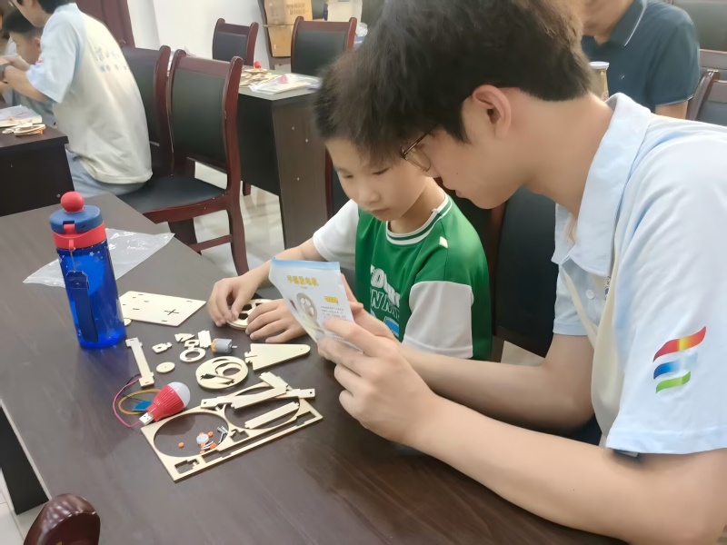 (图为团队负责人王芮进行开班仪式,肖嘉华摄)在课程体验环节,“淮绘星光”志愿服务团成员张琨带来了“太阳能小车——探索光与动力的奥秘”理论与实践课程。课程中,张琨通过生动有趣的讲解,带领孩子们深入了解电能、太阳能等理论知识,从能源的基本概念,到电能与太阳能的产生原理、应用领域等,让孩子们对能源科学有了初步认识。实践课上,孩子们在张琨的指导下亲手制作手摇发电机与太阳能小车,将理论知识转化为趣味实践。他们认真地组装零件、连接线路,在动手过程中探索光与动力的奥秘,现场气氛热烈,激发了孩子们对科学的探索热情。