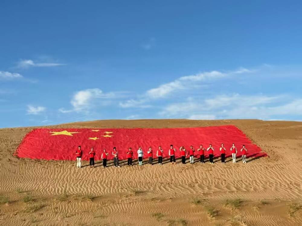 苍茫大漠深处,漠峰之上,猎猎劲风裹挟着细沙,在星穹之下呼啸奔腾。此刻,一面巨幅国旗正被志愿者们奋力展开。