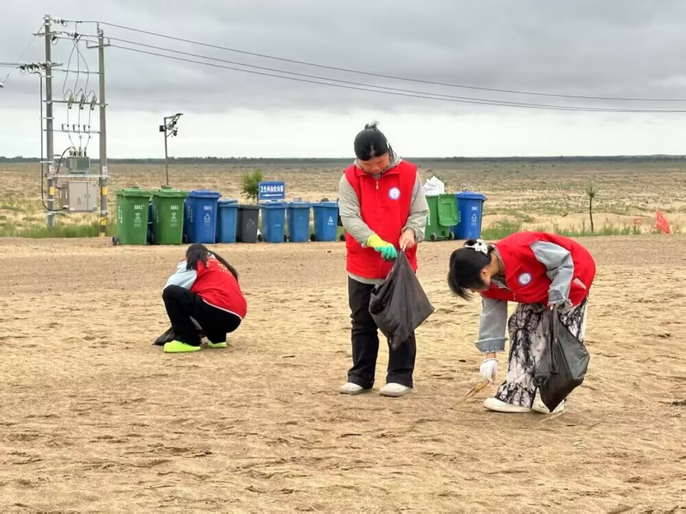 实践团成员的身影,是基地清晨最跃动的色彩。他们手持工具,细致清理散落在梭梭林间、草方格沙障和基地周边的塑料瓶、废弃包装等外来物。每一次弯腰俯拾,都是对脆弱生态的郑重守护。沙粒钻进鞋袜,汗水浸透衣背,年轻的脸庞在阳光下闪耀着坚毅的光芒。沙海无言,但被细心规整后的基地,以更洁净、更富生机的姿态,回应着青春的付出。阳光逐渐升高,汗水浸湿了衣衫,却丝毫没有减退大家的干劲——每清理一片区域,就像为这片脆弱的土地拂去一层尘埃。