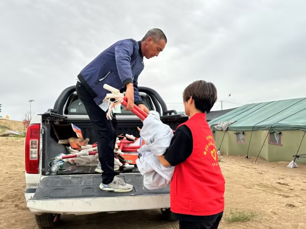 在基地工作人员指引下,队员们迅速投入工作。一摞摞棉被被小心传递安放,似在传递守护安眠的暖意;一张张木桌在默契协作中稳稳立起,为治沙前线运转铺就基底;其余物资也在青年们肩扛手提的接力下,有序抵达指定位置。汗珠滑落浸湿衣衫,却无人停歇,每一次弯腰托举、接力传递,都凝结着对这片土地深沉的关切。
