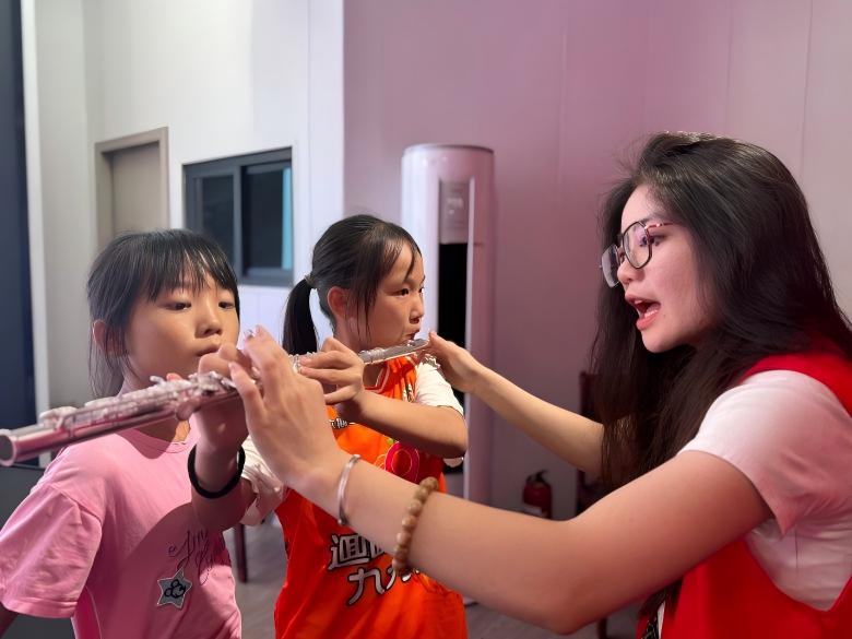 图为志愿者教小朋友长笛。 张曦文通讯员摄