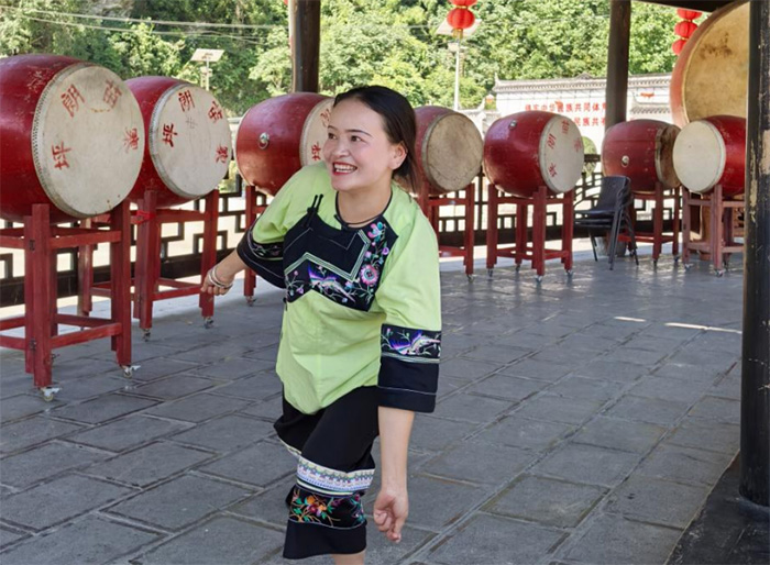(图为小学员与龙秋蓉老师展示苗族鼓舞 摄自钟洁)