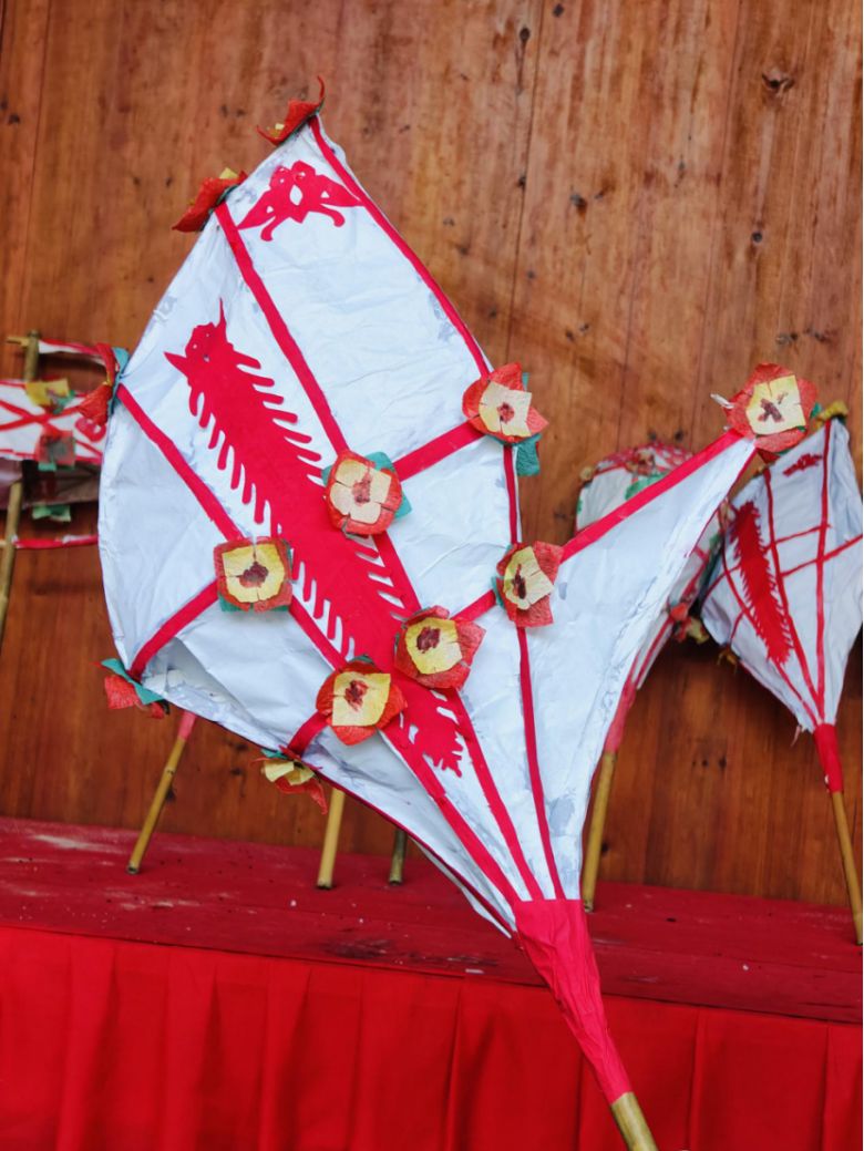 第二步裁华笺:队员们用黄、红、绿三色“种花纸”裁剪象征吉祥的花朵。更具挑战的是用红纸剪蜈蚣,需细致稳定的手法,汪师傅耐心指导着每一剪。剪好的蜈蚣、蝴蝶与花朵被精心粘贴在灯面固定位置,为素雅灯体注入生机与民俗韵味。完成后的灯体需静置风干。汪师傅介绍,正月吉时灯内放置蜡烛,烛光穿透彩纸,这些花鸟虫兽便会在光影中舞动,映照出祈福纳祥的华美篇章。