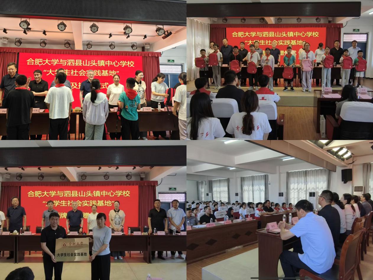 捐赠仪式上,合肥大学向当地捐赠了书包、篮球等物资,为孩子们送去了实实在在的关怀。随后,“合肥大学生社会实践基地”正式授牌,这一举措标志着合肥大学与泗县在实践育人、校地合作方面迈出了新的步伐,将为后续长期开展社会实践活动奠定坚实基础。