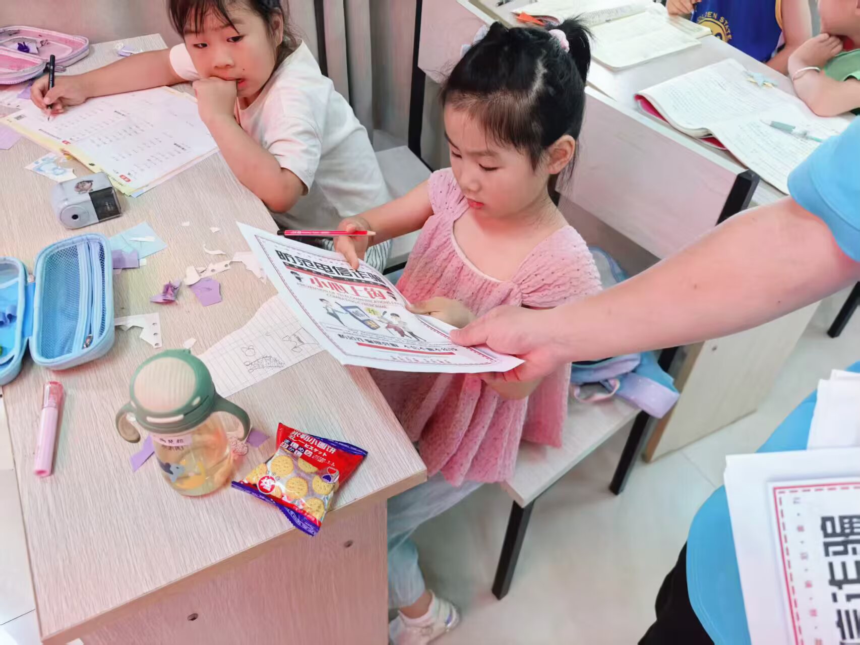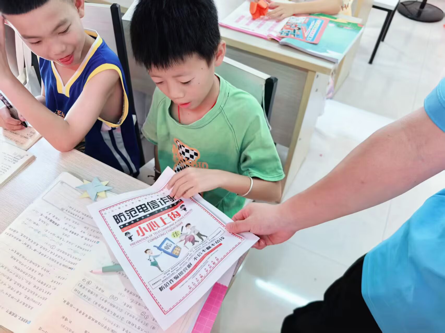 在接下来的环节中,志愿者们发放了防范电信诈骗的宣传手册。孩子们在志愿者的指导下,仔细阅读手册内容,并在手册上做笔记。通过这种方式,孩子们不仅学到了知识,还提高了自我防范意识。