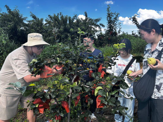 多元实践拓展: 实践周内,团队足迹遍布农场多元业态。我们进入桃子梨子等水果种植区,学生们学习水果栽培管理要点,品尝了甜美可口的梨子;幼鸡鸡舍中,关注不同生长阶段的精细化照料;鸭舍的探访则丰富了大家对农场生态循环与多元化经营的认知,我们站在烈日下,看着波光粼粼的水面上鸭子们欢声笑语。每一次观察与交流,都在拓宽着学子们对现代农业立体图景的理解。
