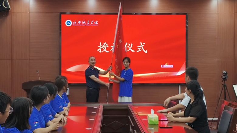 启动仪式的第三部分是书记给团队学生代表授旗。书记将一句句嘱托和信任承载在旗帜上,将这面大旗授予我们。