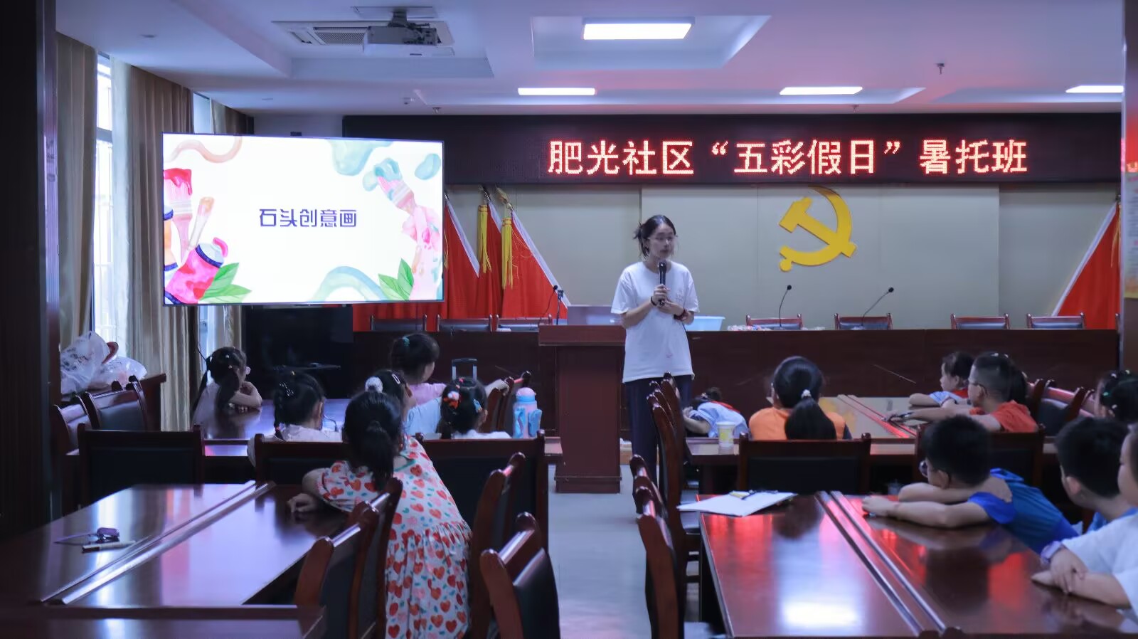 7月7日上午,合肥大学教育学院“薪火传乡韵,师苑‘育’童心”社会实践团队在上派镇肥光社区党群服务中心开展创意美术课程——《石艺童画,环保新生》。本次课程由鲁丹妮老师主讲,旨在引导孩子们观察石头形态、发挥想象力进行动物主题创作,同时让孩子们把石头变废为宝,树立孩子们的环保意识,践行绿色生活理念。