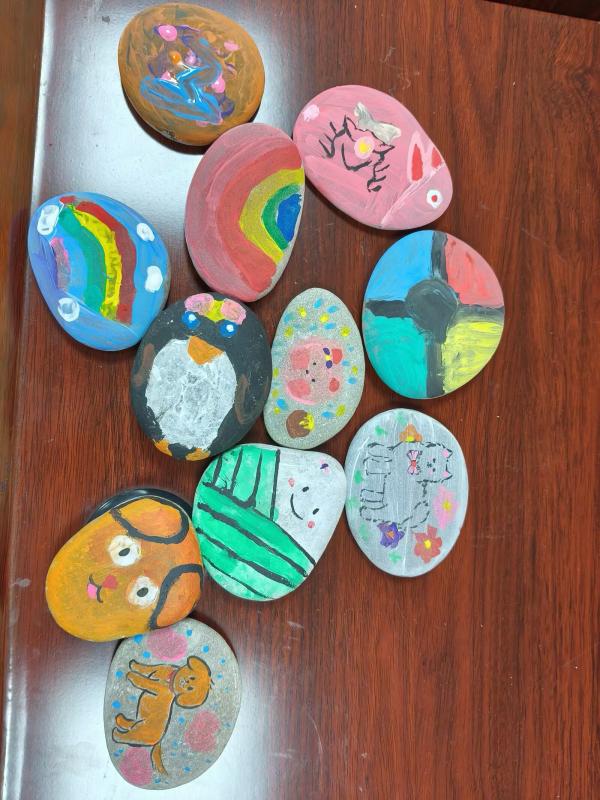 在初步认识石头画的价值之后,鲁丹妮老师通过PPT详细讲解“局部强化”“形态互补”等创作手法并简要解释每个手法的含义和作用,同时也引导孩子们总结石头画创作手法。团队成员们将石头、画笔、丙烯颜料等工具分发给孩子们,带领孩子们对每一块石头进行创意绘画。在老师的指导下,孩子们对石头进行分类、清洗、创作,展现出各种图案的石头:有的像熊猫,有的像小狗……在丙烯颜料的帮助和师生共同的努力下,将原本单调的石头装饰地美轮美奂。