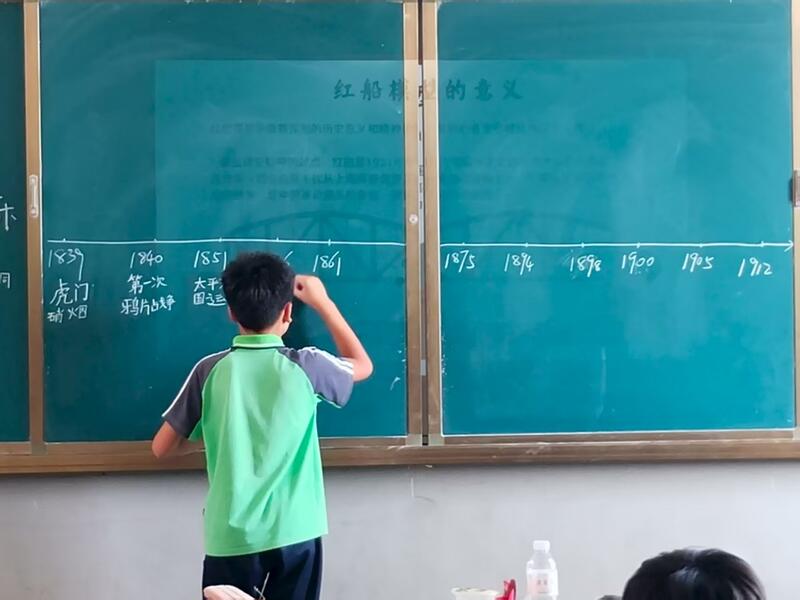 为了让孩子们记住这些事件背后的意义,主动思考历史事件的关联,志愿者老师们采用让孩子们手绘历史时间轴的教学模式来加强记忆。五年级的小豪主动举手要求去黑板上写,从虎门销烟到新中国成立,小豪把时间和所对应的事件都精准地写在了黑板上,受到了志愿者老师们的表扬,其他同学的眼里同样充满了崇拜,齐刷刷地投向他。手绘历史时间轴,不仅让孩子们重温了革命历史,而且帮助孩子们了解历史根源,增强对红色文化的认同感。