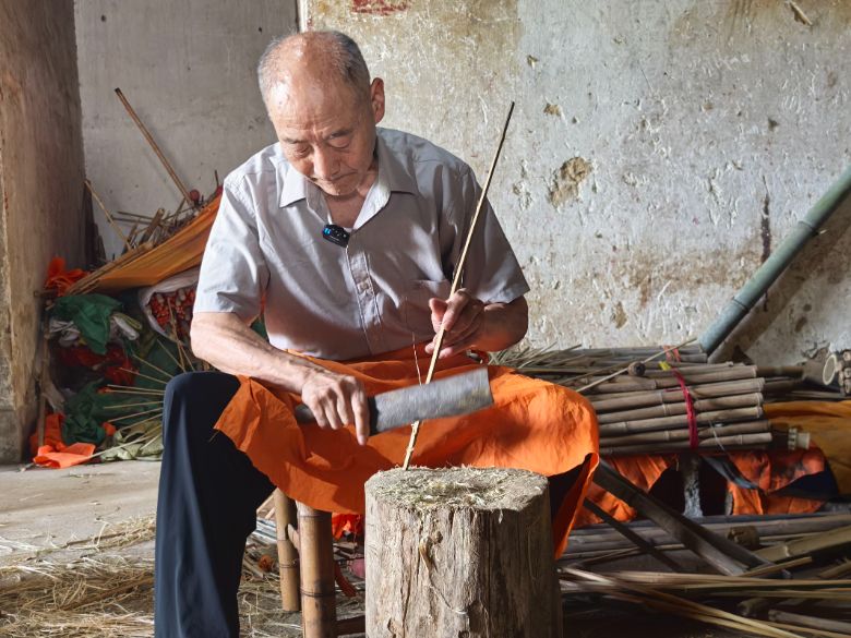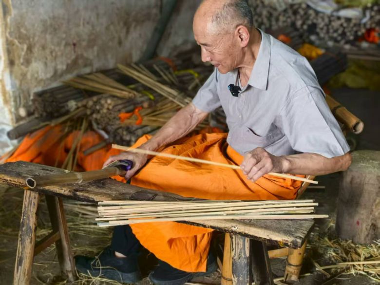 (注:老师傅在示范削竹)