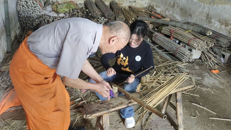 (注:老师傅在示范刮竹)