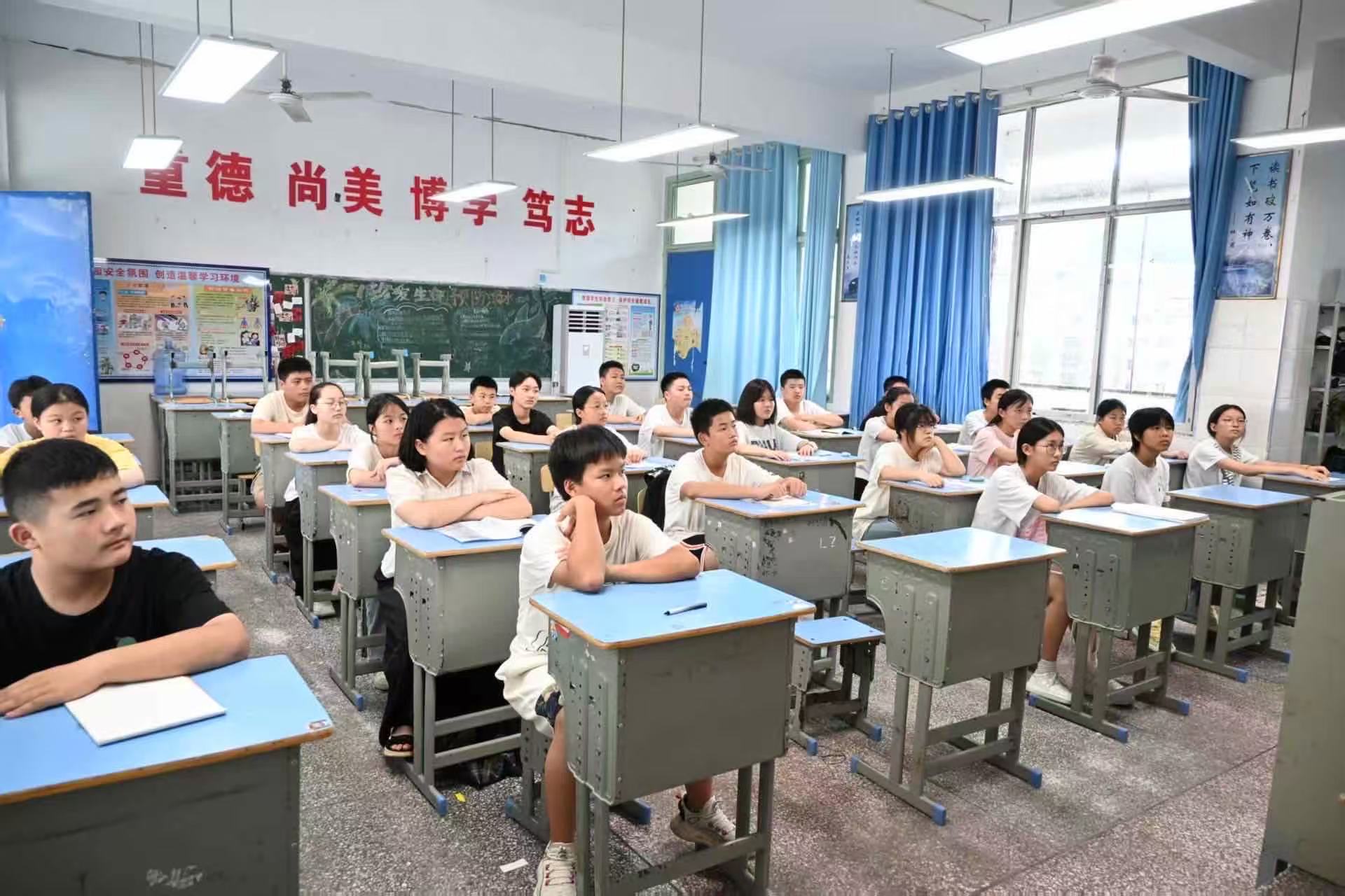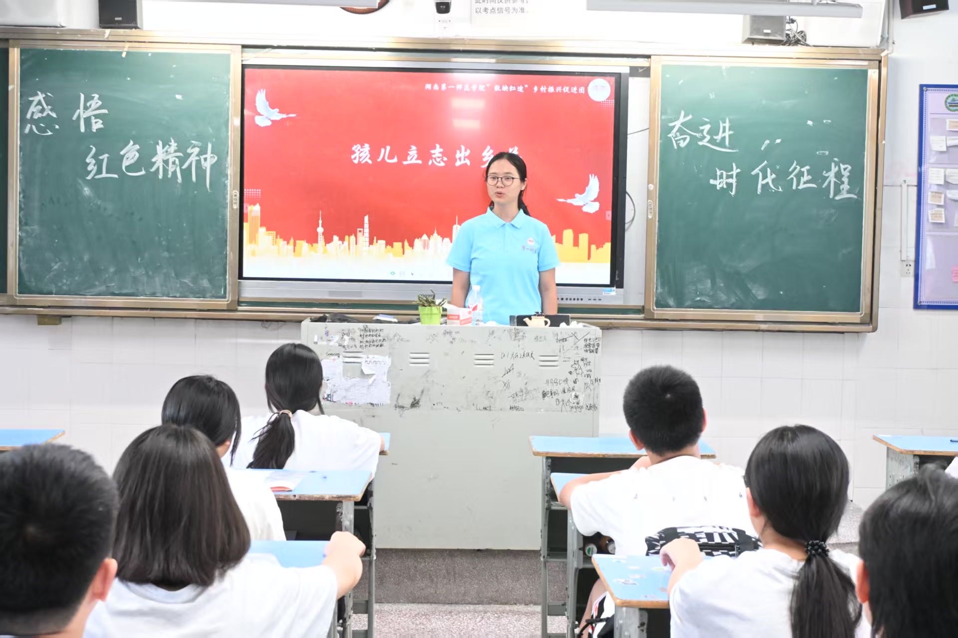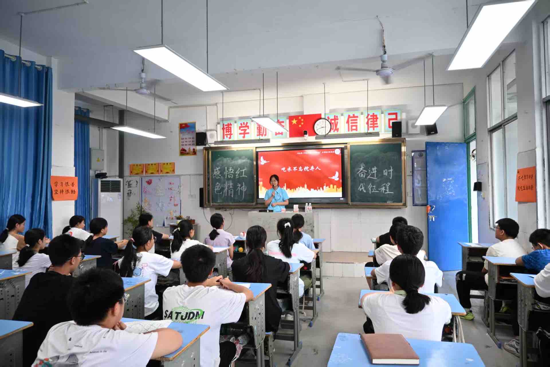 2025年7月9日,湖南第一师范学院数学与统计学院“数映红途”乡村振兴促进团宣讲组的成员,在古丈县民族中学举办了一场以“感悟红色精神,奋进时代征程”为主题的红色宣讲活动。宣讲组的四位同学通过讲述《吃水不忘挖井人》《最后一页日历》《郭亮的遗书》《孩儿立志出乡关》四个经典红色故事,为古丈民中的学子们展现了红色精神的丰富内涵与时代价值。