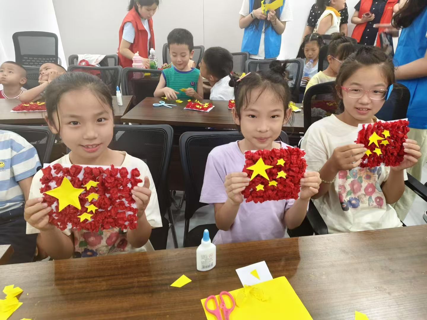 国旗制作环节,志愿者们将红黄彩纸、胶水和剪刀有序分发后,一个6岁的小姑娘捏着黄纸怎么也剪不成星星,实践队员立刻蹲下身示范,传授“五步剪纸法”:将黄纸折成五等份三角,沿特定角度剪下。“看!像变魔术一样!”现场顿时欢呼一片。
