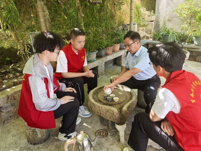 图为实践队队员与高主任讨论如何推动军营村发展。林宸辉摄