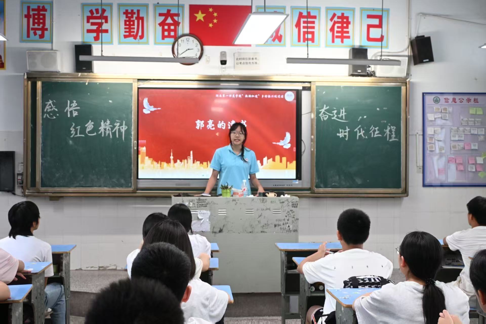 7月9日,湖南第一师范学院数学与统计学院“数映红途”乡村振兴促进团宣讲组成员在古丈县民族中学开展了“感悟红色精神,奋进时代征程”主题宣讲。主要围绕《郭亮的遗书》《吃水不忘挖井人》《孩儿立志出乡关》和《最后一页日历》四个故事展开,带领同学们在历史的红色长河中溯流而上,探寻精神根脉,汲取奋进力量。