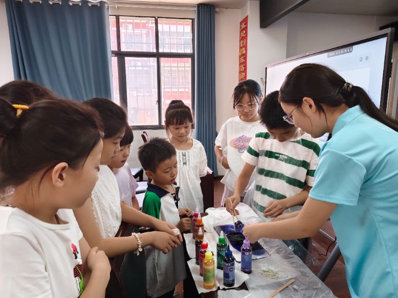 非遗扎染课上,实践团成员将赣地传统蓝染技艺与现代审美结合。从浸染固色到图案设计,孩子们在蓝白交织的艺术创作中,触摸千年染织文化的深厚底蕴,感受非遗技艺的独特魅力。