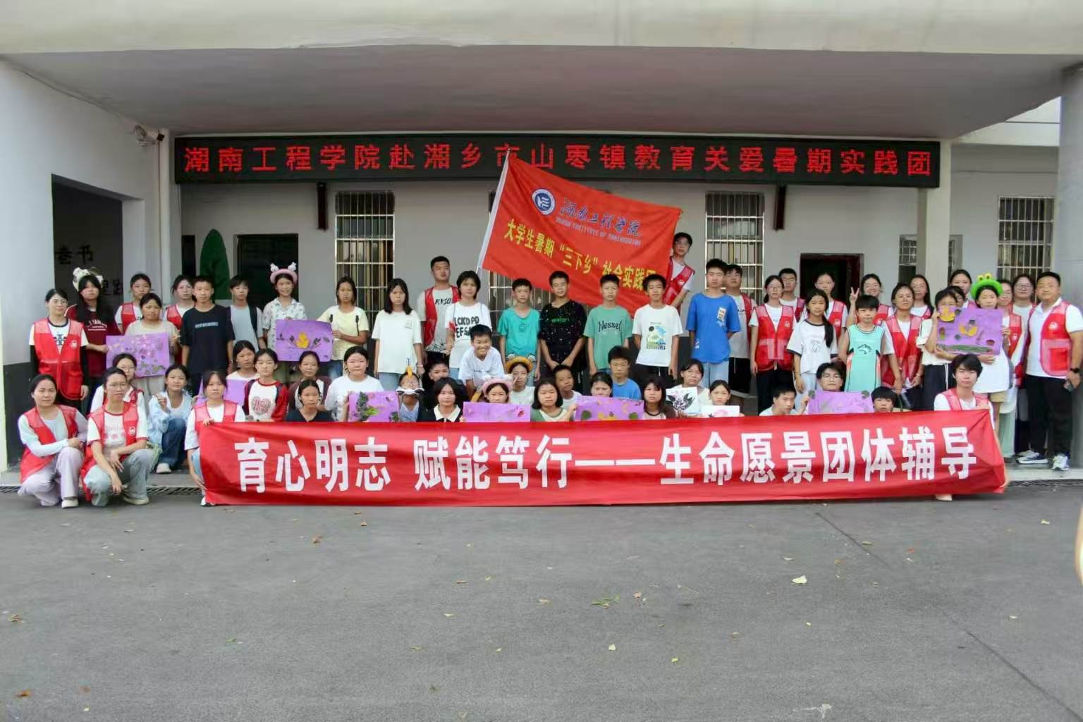 图为湖南工程学院赴湘乡市山枣镇“资助+心理”教育关爱服务团的活动大合照。欧君丹摄
