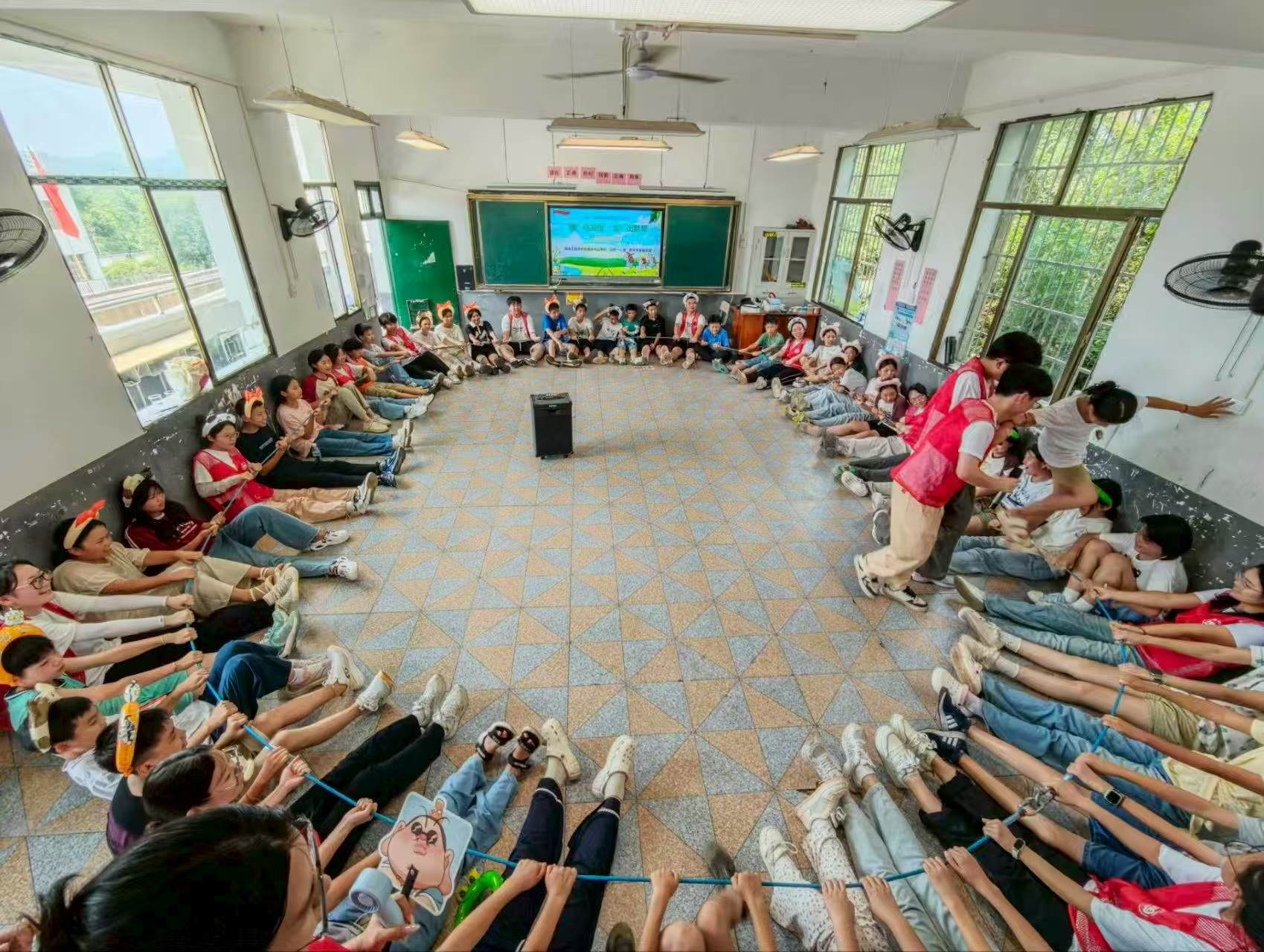 图为大学生志愿者与中小学生正在进行动力圈绳活动。欧君丹摄