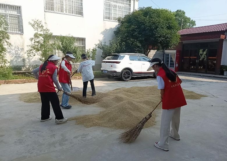 村口的晒谷场是最先热闹起来的地方。农户家的稻谷刚晒透,金黄的谷粒在地上铺开,像一片阳光织成的海。队员们挽起袖子,弯腰用工具将稻谷归拢。汗水顺着队员们的额角滴进谷堆,混着谷物的清香,成了最特别的“防晒霜”。每个人的衣服都已湿透,却没人喊累——看着鼓鼓囊囊的粮仓,仿佛握住了沉甸甸的踏实。